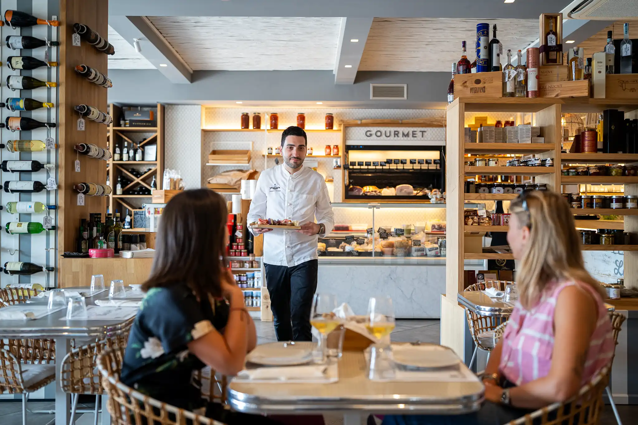 “Taste&Buy – Assaggia & Acquista” questo il Concept: ci siamo immaginati un cliente che possa entrare nel Gourmet, scegliere prodotti freschi dal banco, bottiglie di vino e Champagne da una cantina assortita poterle assaggiare e se lo desidera acquistare.